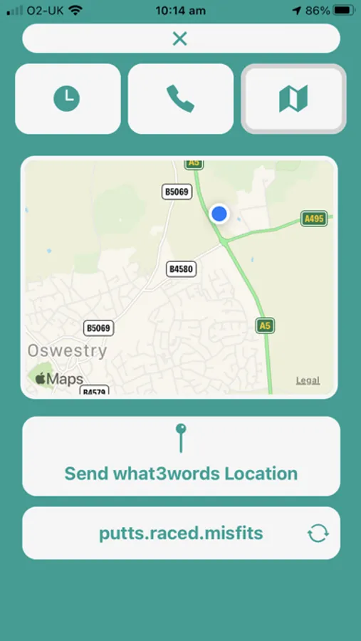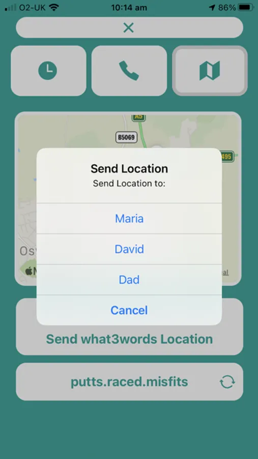 By tapping the ‘map’ icon on the help screen you can open a map to find out where you are – and view your what3words location. If the user is lost and has difficulty in describing their surroundings or difficulty reading the what3words location, they can easily send their location to their named contacts by tapping the ‘Send what3words Location’ button. This allows them to touch the name of the person they want to contact, which creates a text to send to that person automatically incorporating their location and saying they need help.