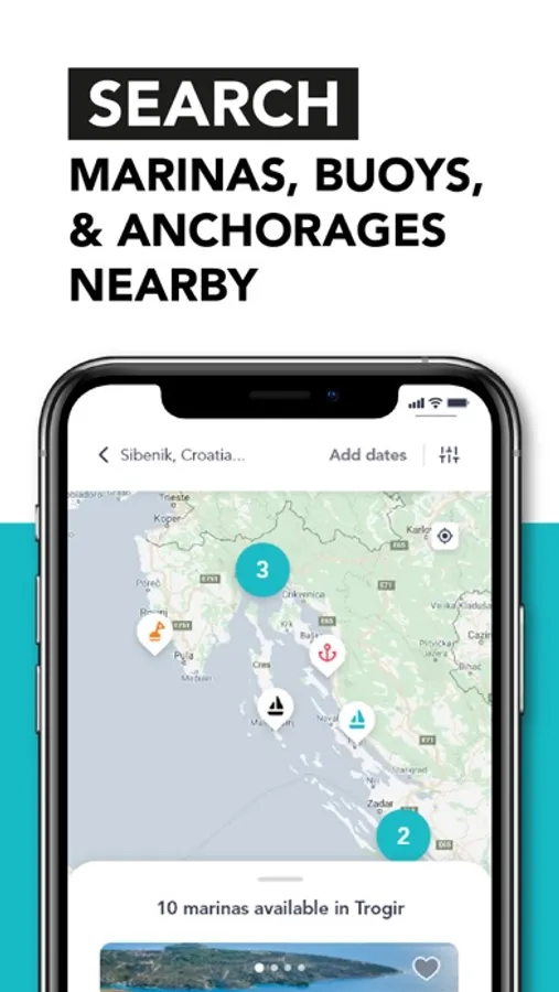 With Seasy, you can book marinas in Croatia, Italy, Greece, Spain, Turkey, France, Portugal, Slovenia, Montenegro, and more from the comfort of your yacht, without any additional booking fees. Browse through thousands of marinas, buoy fields, and anchorages all over the Mediterranean Sea.