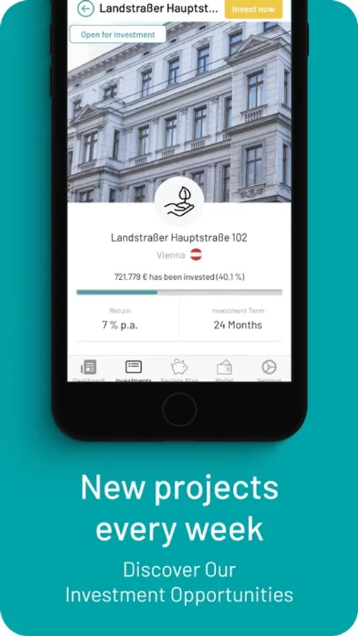 Invest in real estate and build up your digital real estate portfolio within a few minutes. In the app you will find our current investment opportunities in which you can participate easily, directly and without fees. Only solid projects in Austria and Germany from experienced partners, which have been strictly checked and conservatively selected by our real estate experts, are offered to you.