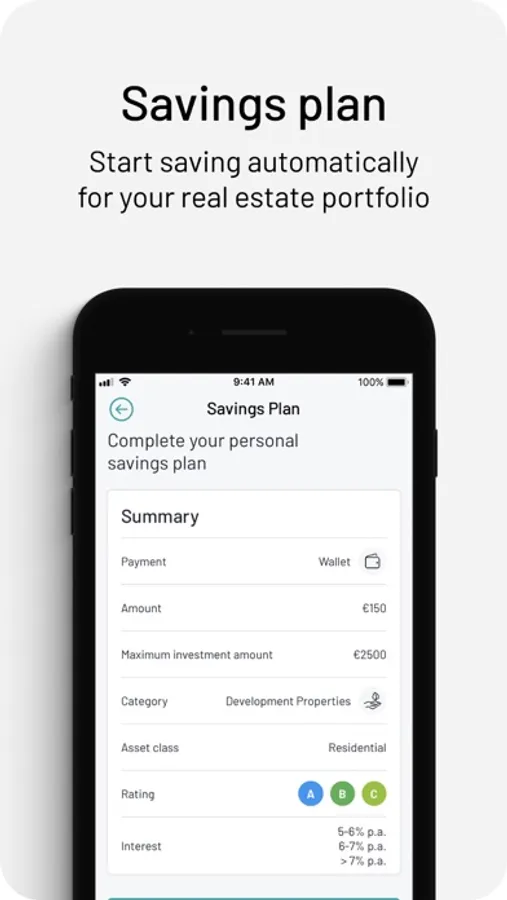 Save automatically for your real estate portfolio. Create your personal savings plan to invest a fixed amount on an ongoing basis and receive automatic interest.
