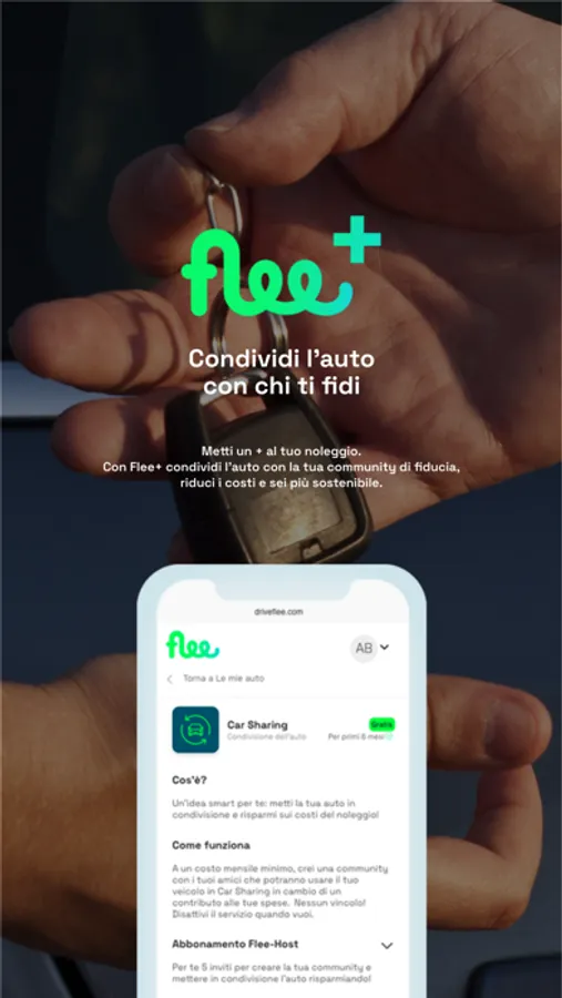 Con l’App MyFlee, hai la possibilità di mettere in condivisione la tua auto Flee con chi vuoi tu, creandoti una community di fiducia. Rendere disponibile l’auto al noleggio è semplicissimo: all’interno dell’app MyFlee, entrando nella sezione “Servizi” puoi abbonarti a Flee+ diventando un Flee-Host. Così puoi condividere l’auto e approfittare dei vantaggi.