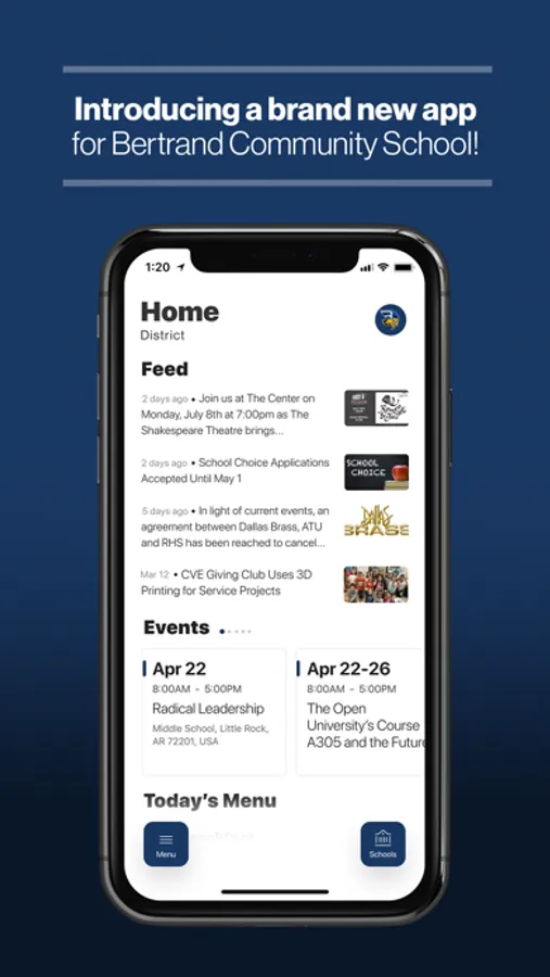 The event section shows a list of events throughout the district. Users can add an event to your calendar to share the event with friends and family with one tap.