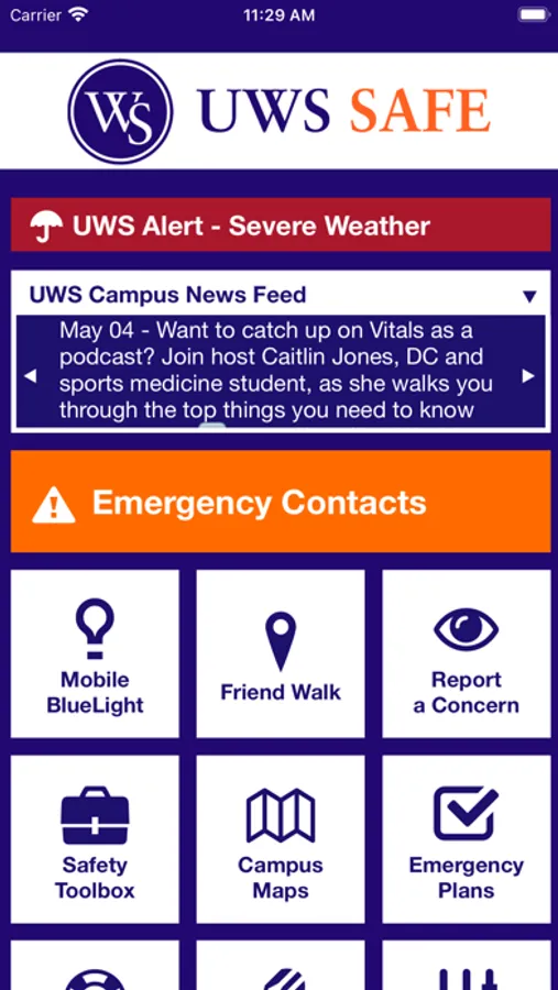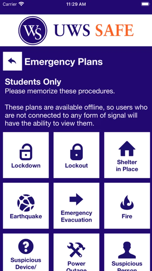 - Emergency Plans: Campus emergency documentation that can prepare you for disasters or emergencies. This can be accessed even when users aren’t connected to Wi-Fi or cellular data.