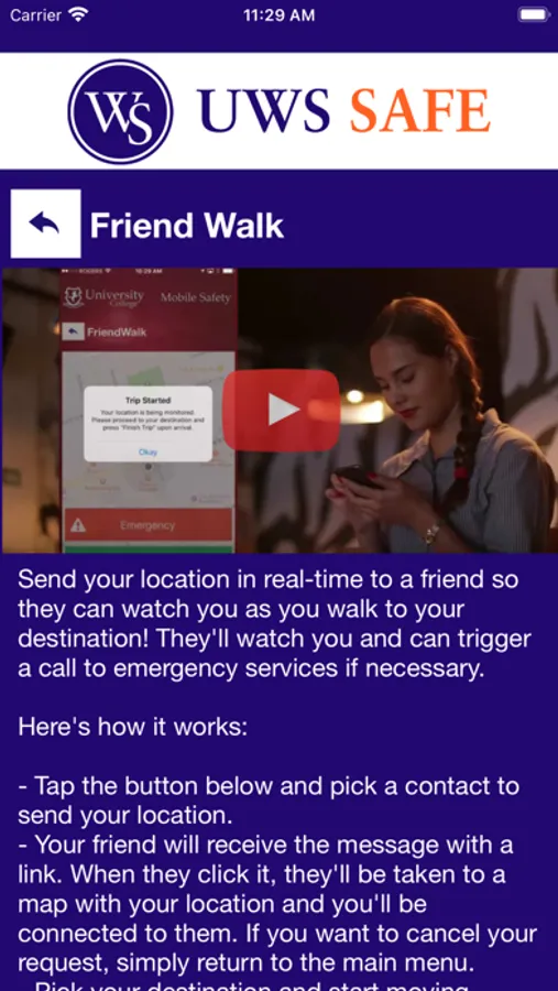 - Friend Walk: Send your location to a friend through email or SMS on your device. Once the friend accepts the Friend Walk request, the user picks their destination and their friend tracks their location in real time; they can keep an eye on them to make sure they make it safely to their destination.