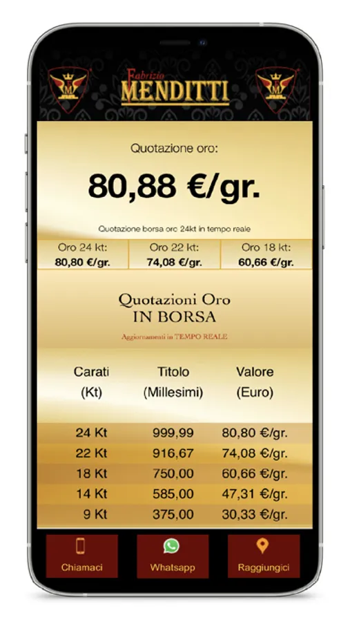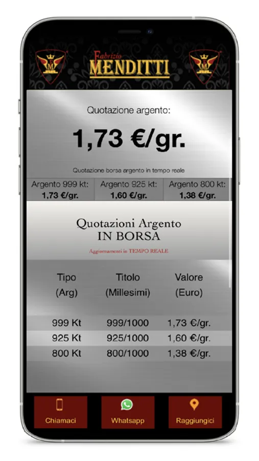 Scarica ed utilizza quotidianamente la nostra applicazione per essere sempre aggiornato in tempo reale sulle quotazioni in borsa di oro e argento. È importante utilizzare la nostra applicazione perché conoscere il valore reale dei metalli preziosi è necessario per effettuare una vendita precisa ed ottenere sempre la Massima Valutazione!