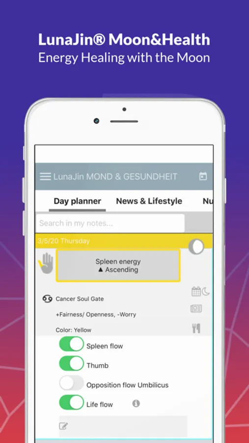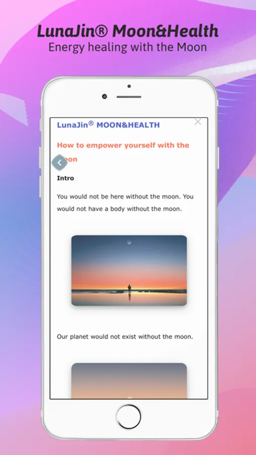 LunaJin® is an app for the practical part of Irene Lauretti's book "Der Mond und der kosmische Code der Schöpfung" (The Moon and the Cosmic Code of Creation).