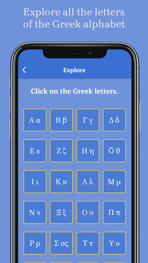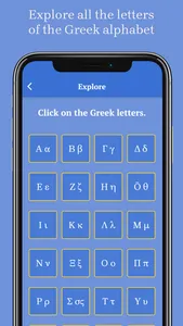 - the Explore page allows users to see all the letters of the Greek alphabet (upper- and lowercase) and click on them to see their English names and listen to their pronunciation.