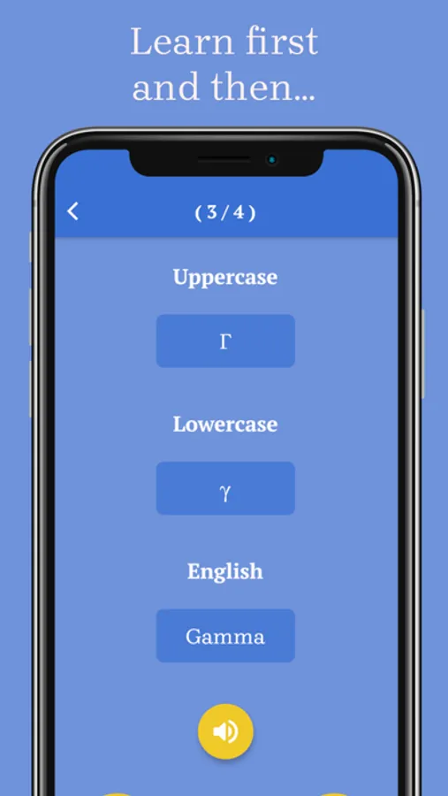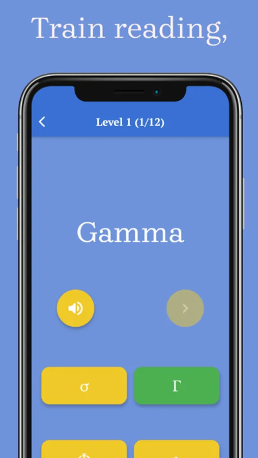 In the Reading mode, you can learn the letters from Greek to English or from English to Greek. At the beginning of each level, four letters are introduced one by one and you should try your best to remember them. After going through 4 learning cards, you will start a quiz game, which trains and enhances your knowledge. Along the way, you can always listen to the English pronunciation of the letters.