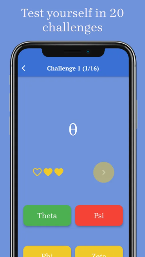 In short, a level focuses on introducing and training new letters while a challenge tests what you’ve learnt. In a level, first a few new letters will be introduced and you should try to remember their Greek letters, English names or pronunciation (depending on the mode). Then you’ll start a quiz game to train your knowledge. In a challenge, you must make less than 3 mistakes to pass it.