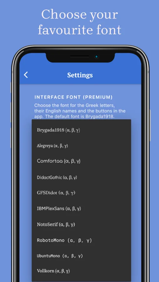 Under Settings in Greek Alphabet Academy, you can change the font of the Greek letters and their English names as well as the button text. You can also enable/disable the button sound, correct/wrong sound (when you answer a question correctly or wrong), button vibration and vibration on error.