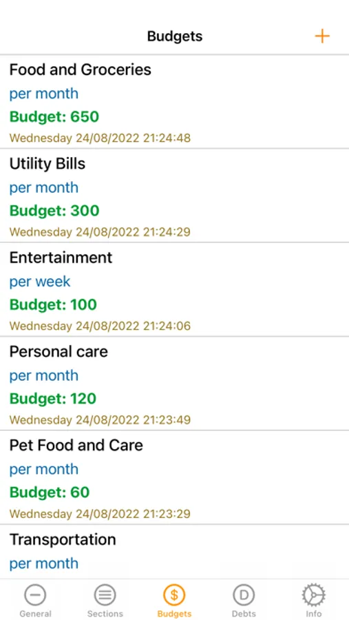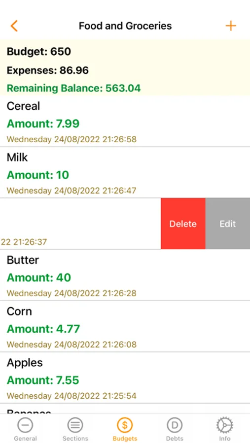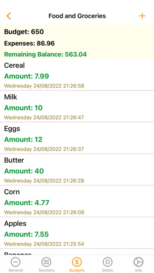 Third: budgets, you can add budget and amount, for example supermarket, and every time you buy from the supermarket you just add the item and the amount, also you can add description as an optional.
