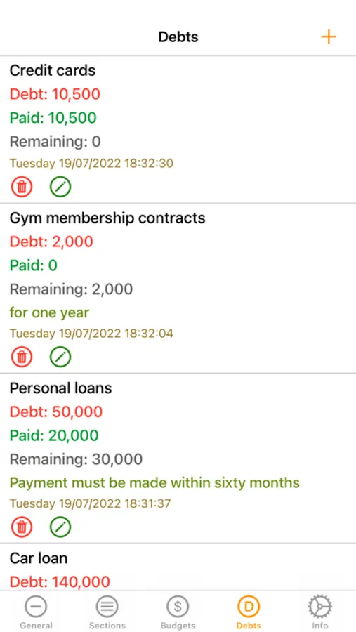 Fourth: Debts. In the general section, debts can be divided into sections, such as personal loans and car loans. In each section, a payment can be added, whether the debt is fully paid or part of the debt is paid. Also, you can increase the debt in each section.