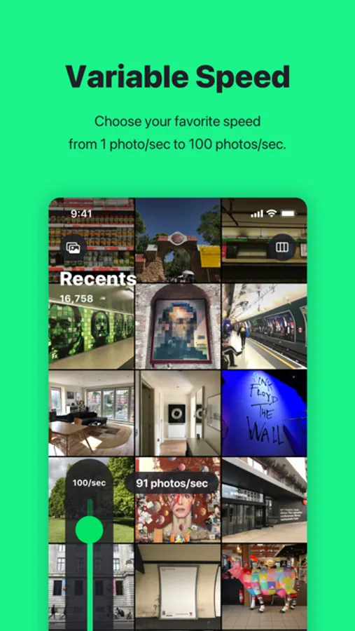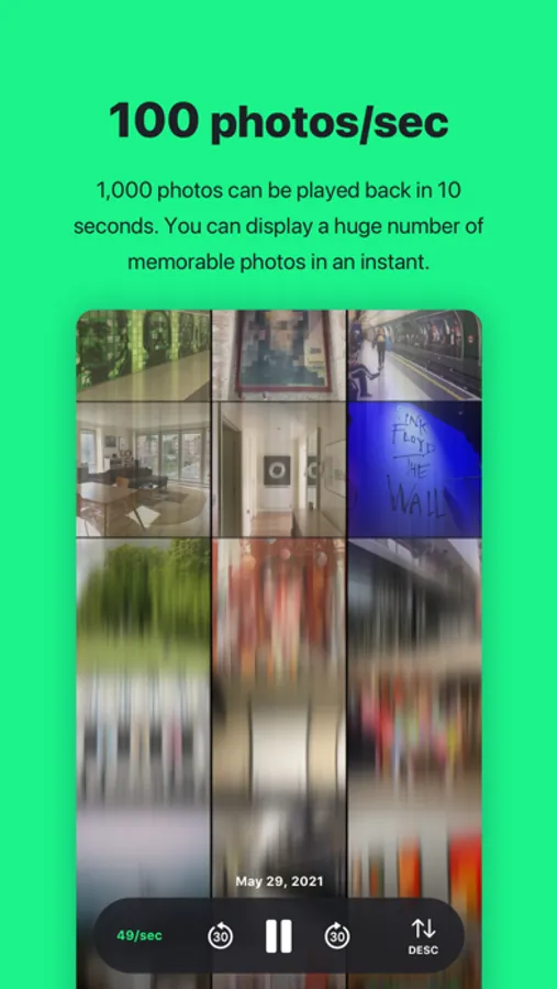 It can play 100 photos/sec at maximum. So, you can see 1,000 photos in 10 sec. The playback speed can be changed from 1 photo/sec to 100 photos/sec.