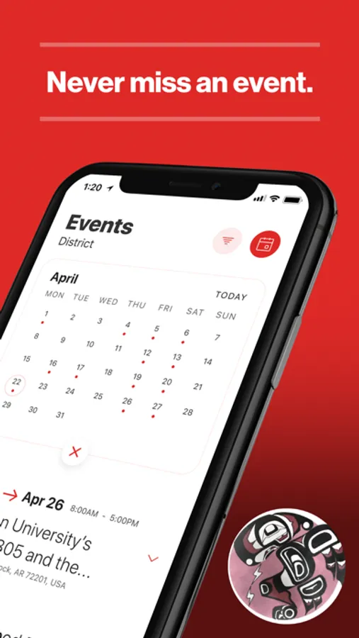 The event section shows a list of events throughout the district. Users can add an event to their calendar to share the event with friends and family with one tap.