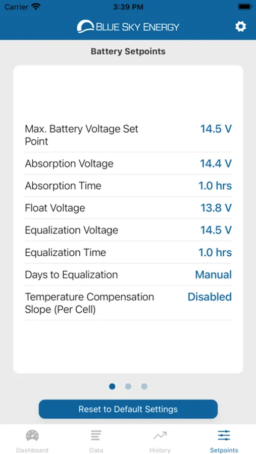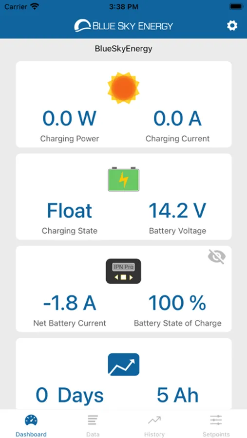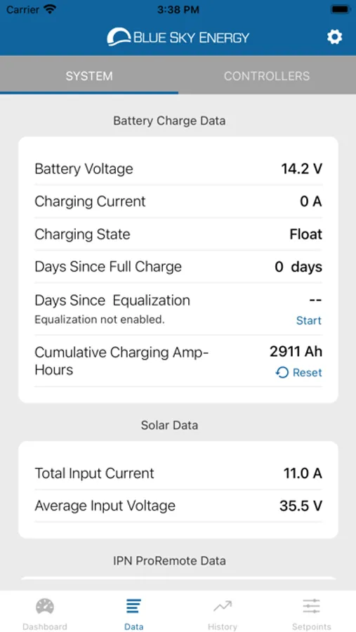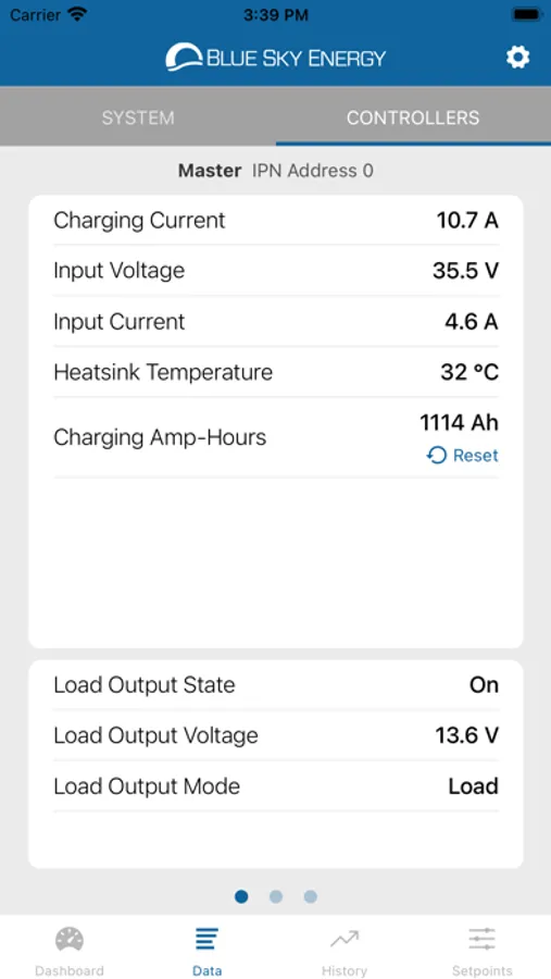 The BT Connect app displays over twenty different measurements so you can monitor your system in real-time. Check out the Dashboard for a quick look at values like battery voltage and charging power. Head over to the Data page for a more in-depth look at your system and see how each controller is performing.