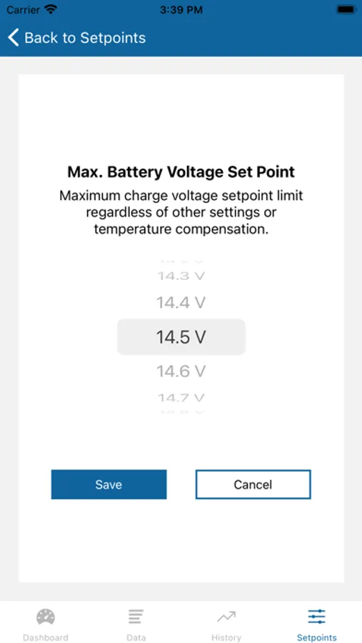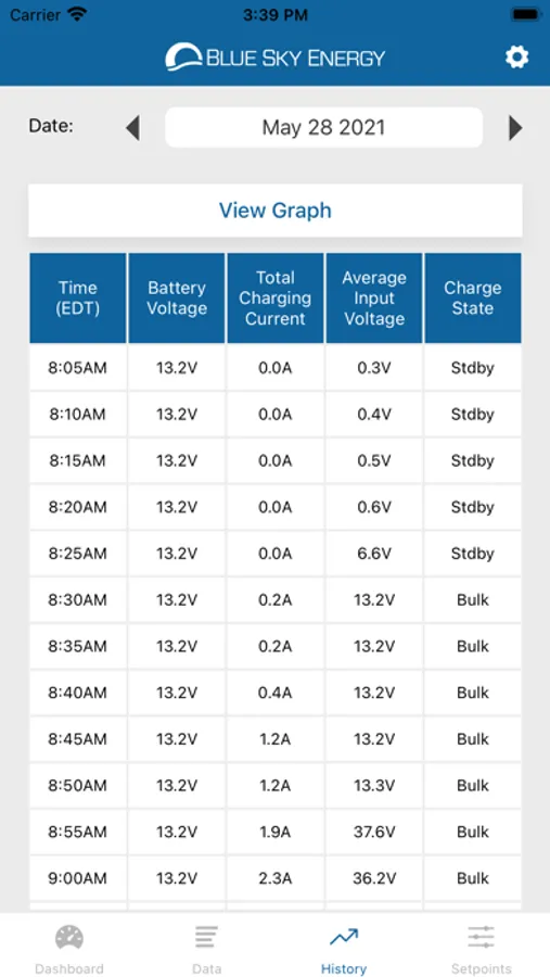 Away from your system for a few days and want to see how it performed? The BT connect takes a snapshot of your system every five minutes and displays your battery voltage, charging current, input voltage, and charging state in a table. Click on the graph to see how the charging current and battery voltage changed over the day, week, or month. This data can be saved locally to your phone, so you can take a look at your history without a Bluetooth connection.