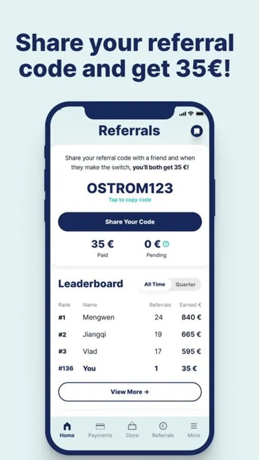 Get your exclusive referral code, share it with your friends, and watch your referral bonuses grow. For each successful referral, you get 35 € credited to your invoice or 50 € credit to use in the Ostrom Store — your choice!