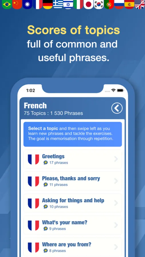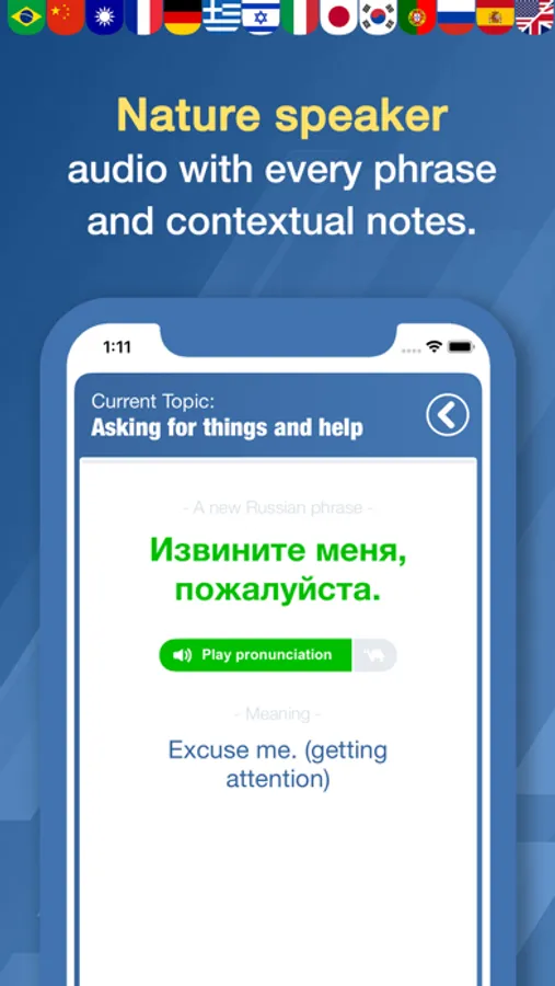 'Phrases' features hundreds and hundreds of common colloquial phrases organised into topics and all with native speaker audio pronunciation. Language acquisition is re-enforced with exercises that emphasise reiterative exposure to each phrase, and most especially repeated exposure to the phrase's pronunciation.
