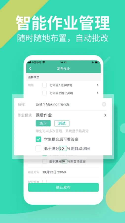 习习向上教师端为老师提供高效的教学管理平台和服务。在这里,您可以随时随地在线布置/检查作业;平台自动批改作业并提供全面的学情报告,帮助您减负增效。