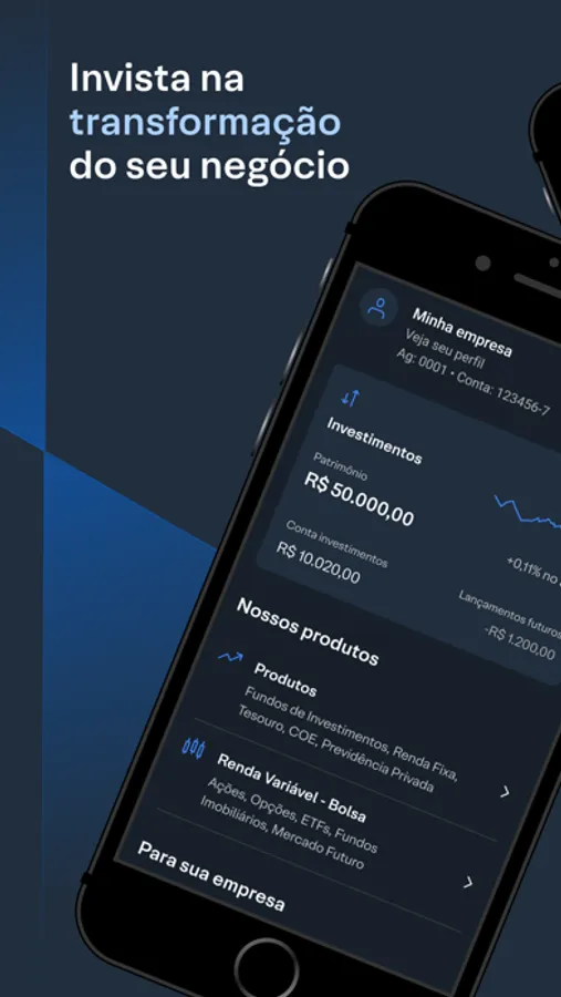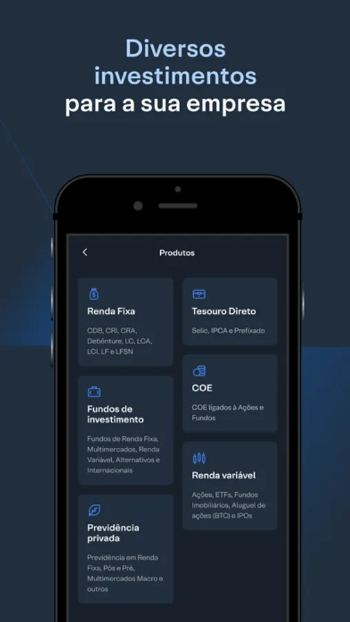 O app da XP Empresas é exclusivo para clientes. Abra a sua conta e conheça o melhor jeito de investir no mercado financeiro, seja em renda fixa e renda variável, como CDB, COE, FII, bolsa de valores, trading e fundos de investimentos.