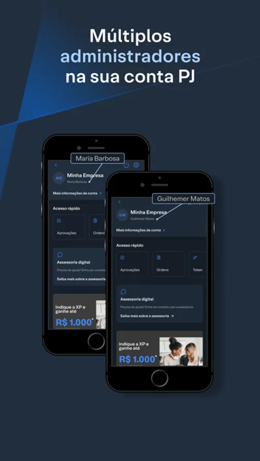 Você consegue criar diferentes usuários com permissão para acessar o app XP Empresas e gerir a conta da sua empresa.