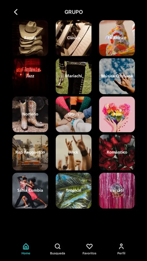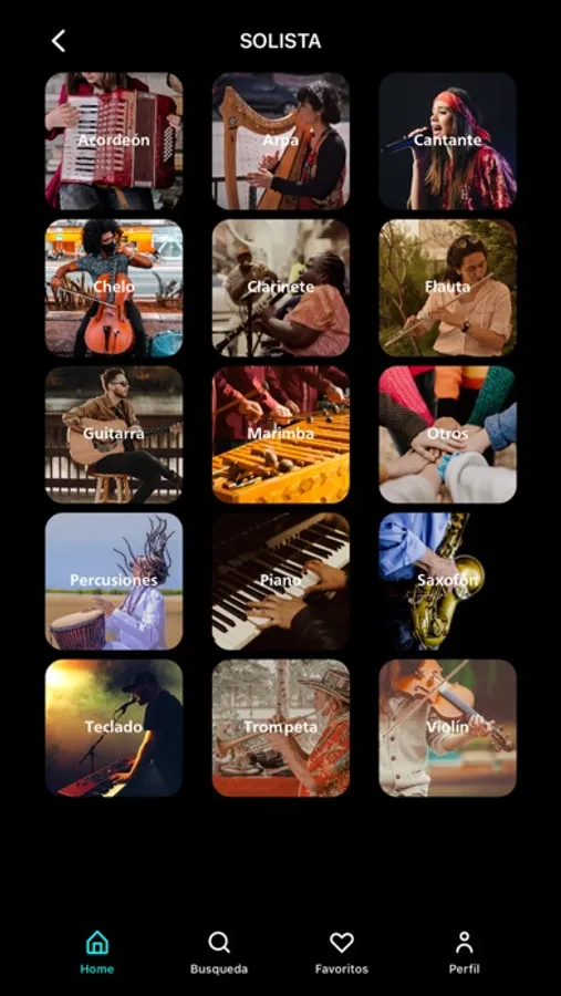 Busca artistas en las diferentes categorías: grupo musical, solista, DJ o sonido; filtra tus resultados por género (Pop, Rock, Versátil, Jazz, Banda, Norteño, etc.) o por instrumento musical (violinista, tecladista, saxofonista, cantante y más).