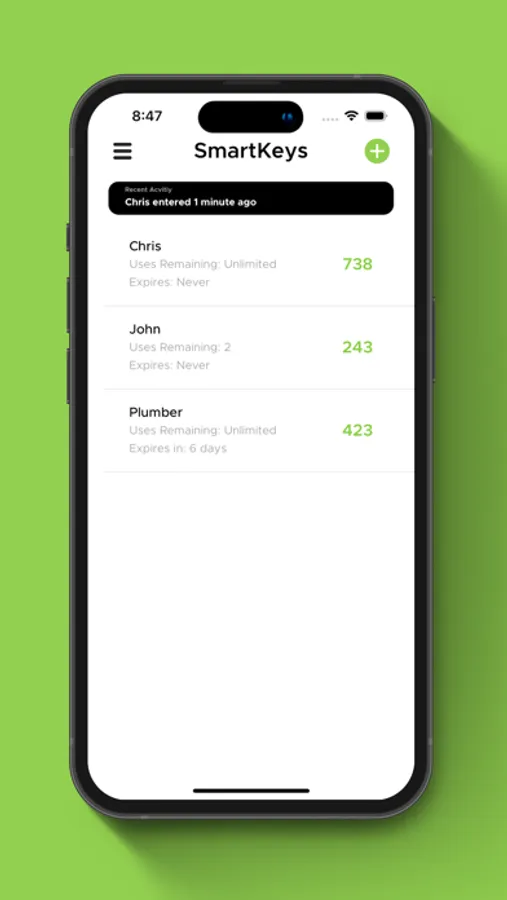 Giving out your apartment's entry code creates a security vulnerability that puts you, your belongings, and family, at risk. With SecuriKey, you can create entry codes that work only once or up until a certain date. Rest comfortably knowing that your delivery driver, old friends, or maintenance workers will never be able to enter your building again with the entry code you gave them. With the SecuriKey app, you'll be able to create smart dynamic entry codes with just a few taps! It's like having a Digital Doorman!