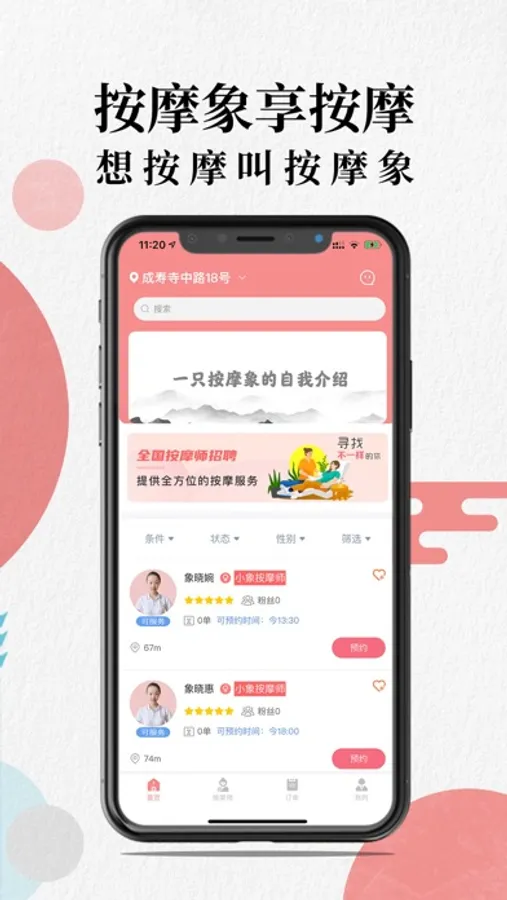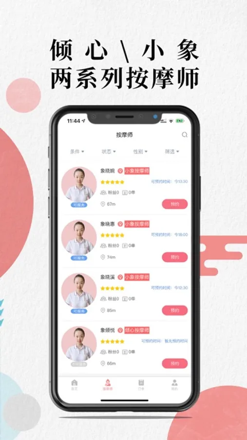 按摩象APP有两大类按摩师,一类是倾心按摩师(颜值高、善交流、有特色);另一类是小象按摩师(亲民体贴、技艺非凡),小象按摩师包含小象推荐按摩师(小象按摩师中的优秀按摩师)