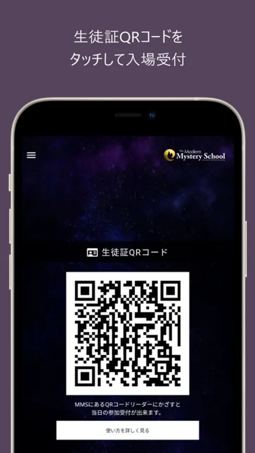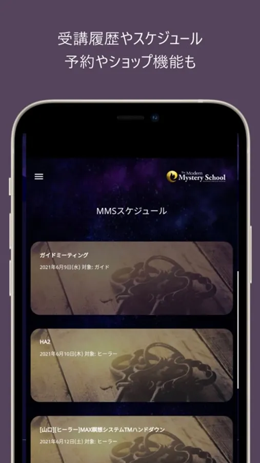 MMS待望の公式アプリがついに公開! 「MMS生徒手帳」はお使いのスマートフォン・タブレットで使えるMMS公式アプリです。自身の受講履歴の確認や、開催スケジュールの確認、予約、生徒証QRコード、専用のショップ機能もついて、アデプトプログラムを受講済の生徒であれば、誰でも利用する事が出来ます。