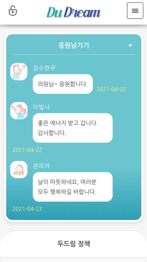 응원남기기, 두드림정책 확인하기, 김두관 의원 활동 등 많은 것을 보고 확인하실 수 있습니다.