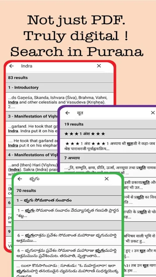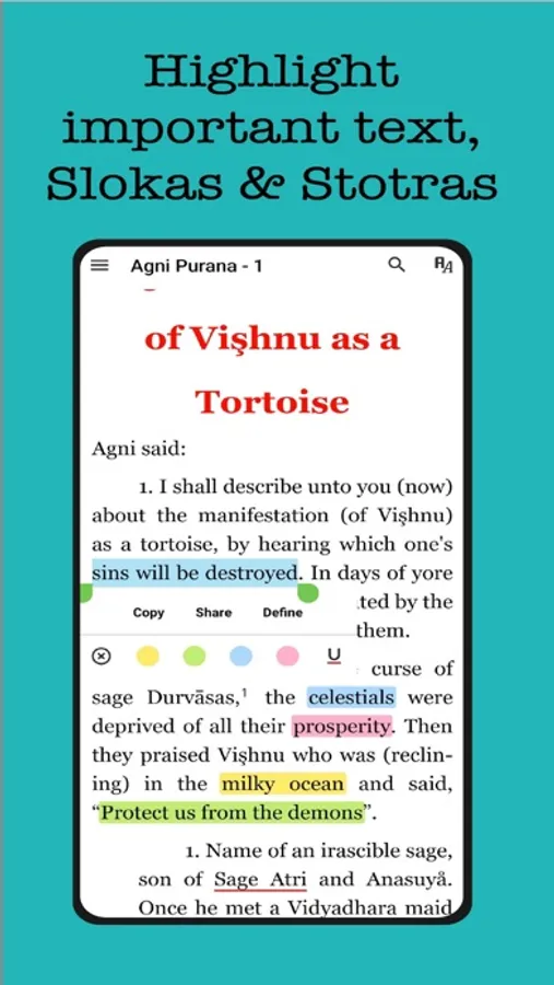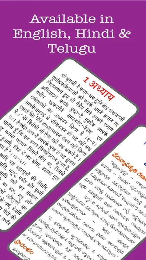 Puranas app brings ancient Indian wisdom to the new generations through cutting-edge technology. Many other apps publish scanned PDFs that are not optimized to read on mobile devices. Instead, Puranas are available in neatly formatted true digital text. Users can adjust the font sizes and use light or dark mode to read during the day or night.