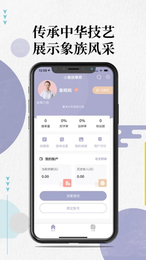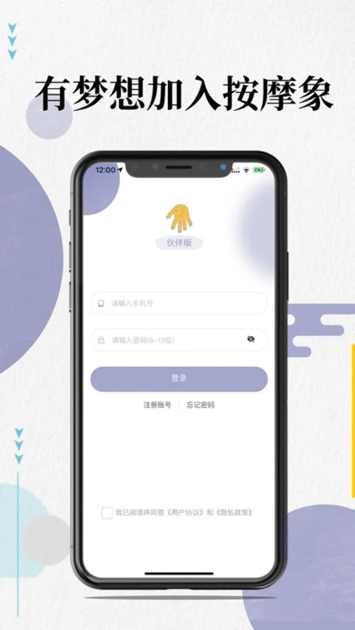 按摩象伙伴版app的使用者为长春舒兮健康管理有限公司(按摩象)的合作按摩师,是按摩师实现申请注册并在网上接受订单、提供上门服务的管理平台。按摩象的按摩师都是既有梦想又有行动的人,是按摩象的好伙伴。按摩象将为我们的好伙伴提供最大的支持,欢迎使用按摩象伙伴版app,加入我们,一起朝梦想出发!