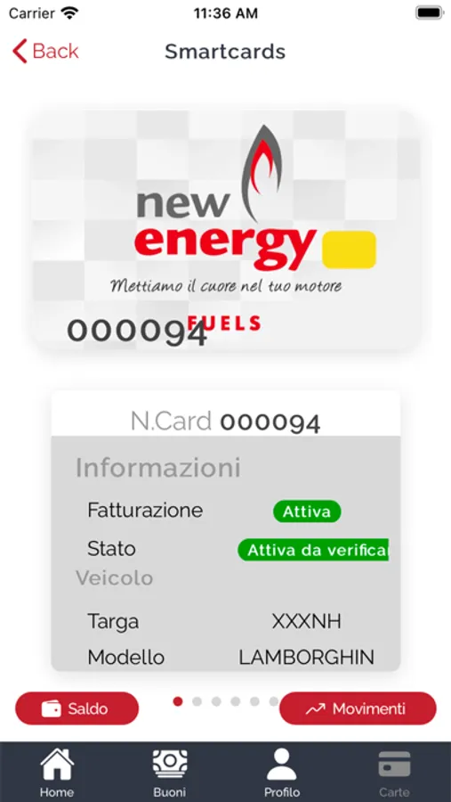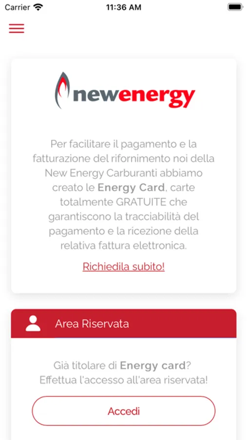 Per facilitare il pagamento e la fatturazione del rifornimento noi della New Energy Carburanti abbiamo creato le Energy Card, carte totalmente GRATUITE che garantiscono la tracciabilità del pagamento e la ricezione della relativa fattura elettronica. Inoltre sia per privati che per aziende l'EnergyCard consente di avere ulteriori sconti sul METANO.