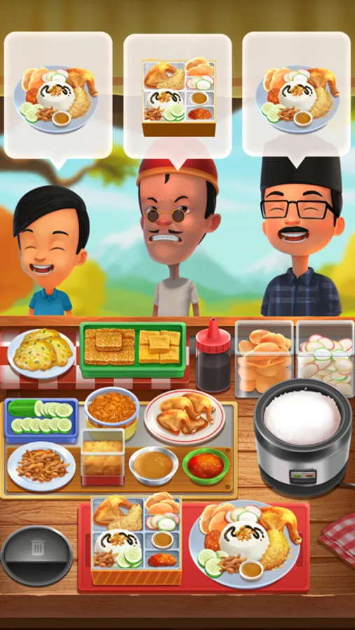 Latih kecepatan dan manajemen waktumu secepat-cepatnya menyediakan nasi uduk untuk pelanggan yang datang tanpa henti.