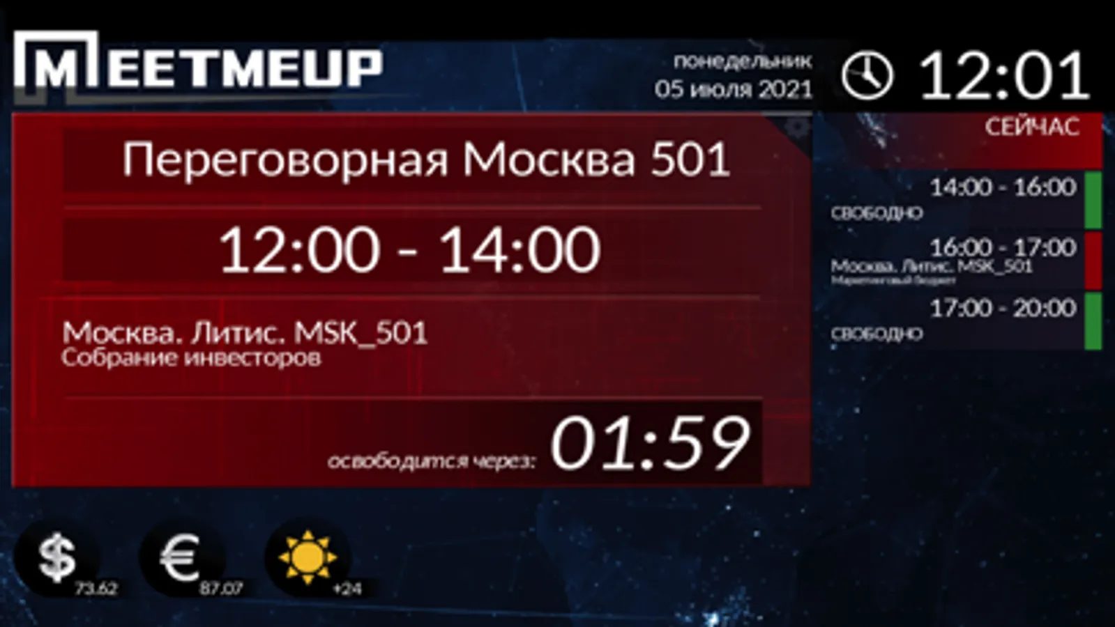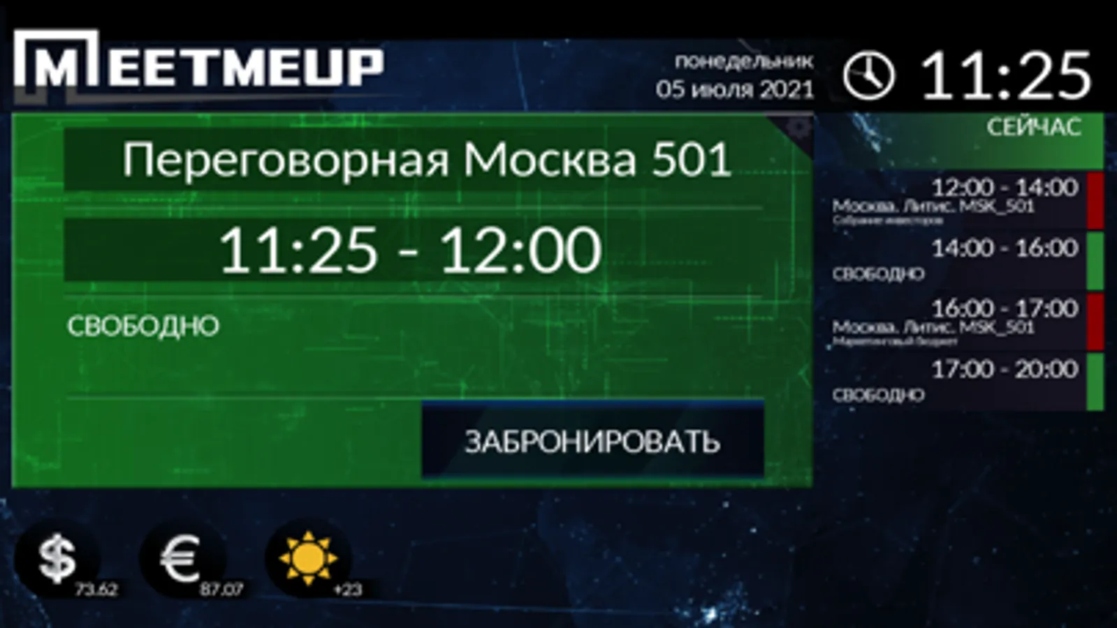 MeetMeUp - система бронирования переговорных комнат. Приложение отображает статус занятости переговорных комнат, а также позволяет осуществить их бронирование. Приложение работает с календарем exchange, office365 и yandex. Для корректной работы приложения, в настройках необходимо указать данные для подключения к серверу.