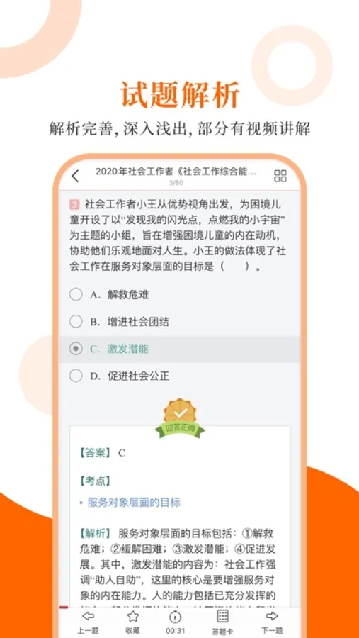专为社会工作者考试精心准备的考试配套题库,每一道试题都有答案解析,为考试提供了充分的复习准备,可随时随地学习练习,支持手机、平板多端同时使用。