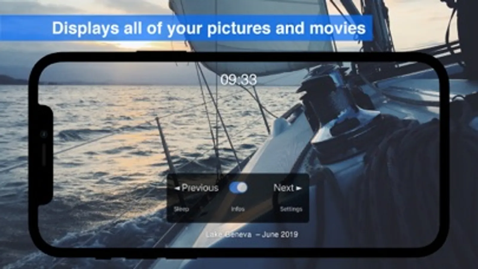 • Display on-screen informations such as Clock, Folder name, Picture time and localisation (EXIF).