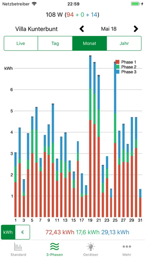 Mit der Wochen und Monats-Ansicht verfolgen Sie Ihren Verbrauch über längere Zeiträume.