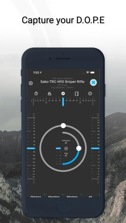 Capture Distance, Wind Direction, Wind Speed, Slope, Time of day, Weather conditions, Notes, Photos, Windage and Elevation by using the device's sensors, or by entering it manually.