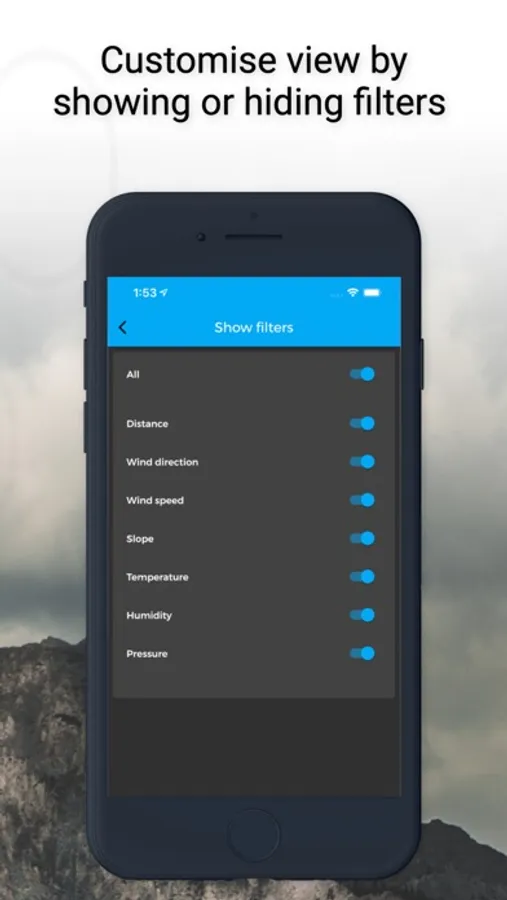 Real time filtering by entering ranges for Distance, Wind Direction, Wind Speed, Slope, Temperature, Humidity, Pressure, Notes, or Location name. View all captured values in a table, or go to the detailed view for more information on that entry.