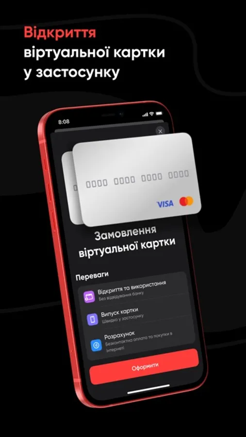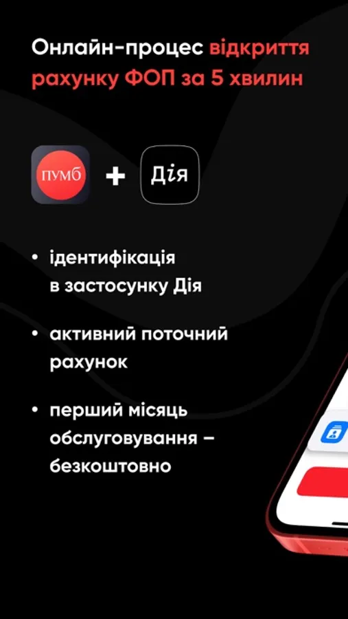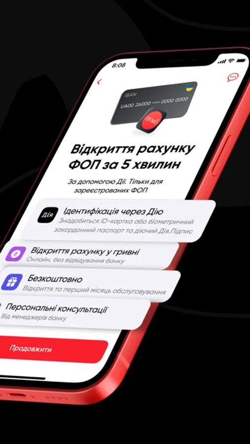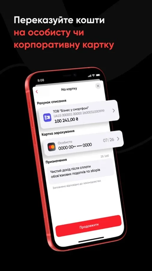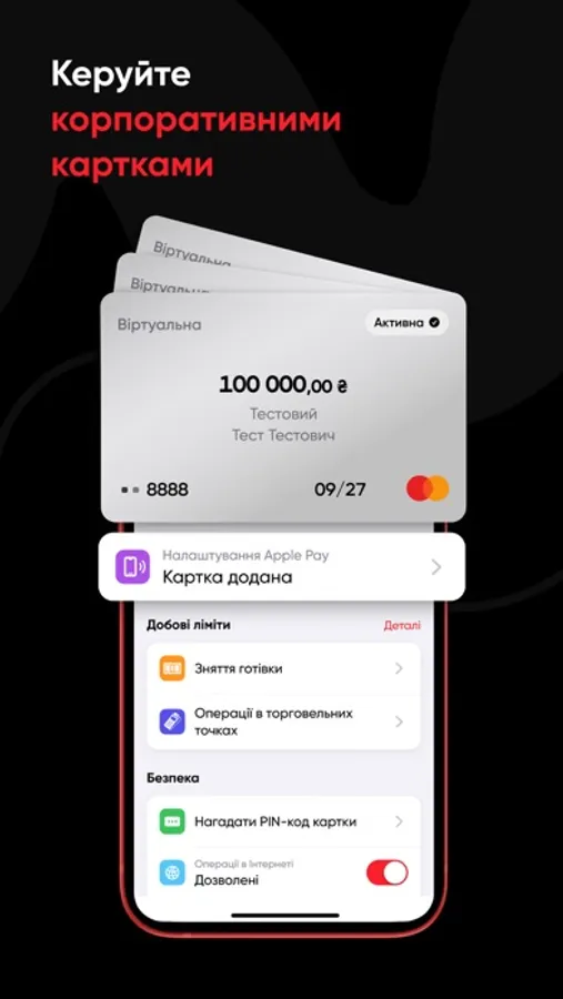 - Керування корпоративними картками: випуск віртуальної карти для ФОП; перегляд реквізитів (повний номер, термін дії та CVV-код); перегляд та пошук транзакцій; керування налаштуваннями; додавання в електронний гаманець (Apple Wallet).