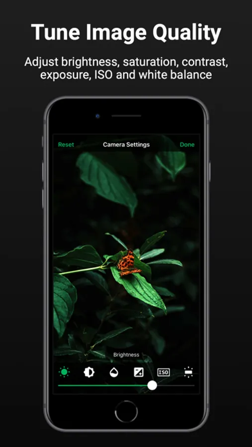 • Tune image quality. Adjust brightness, saturation, contrast, exposure, ISO and white balance.