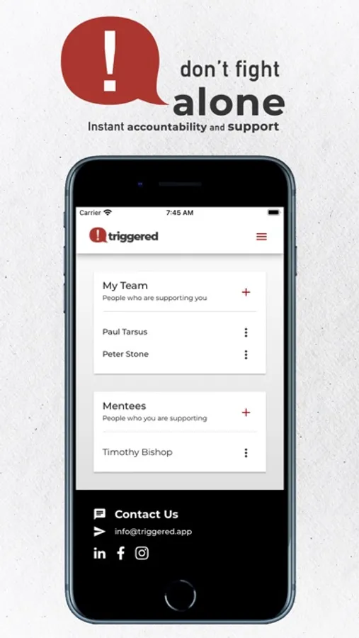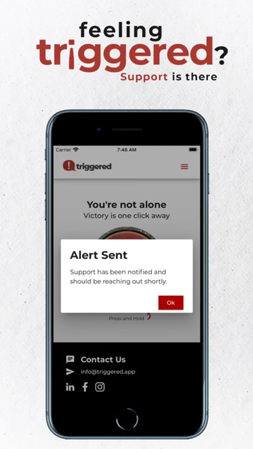 If you are struggling with addiction, simply subscribe for the Triggered app, download the app and build your support team. When you are feeling tempted, all it takes is one click of a button and we will notify your team via text, email and push notifications. They will respond to you with support and encouragement you need to overcome.