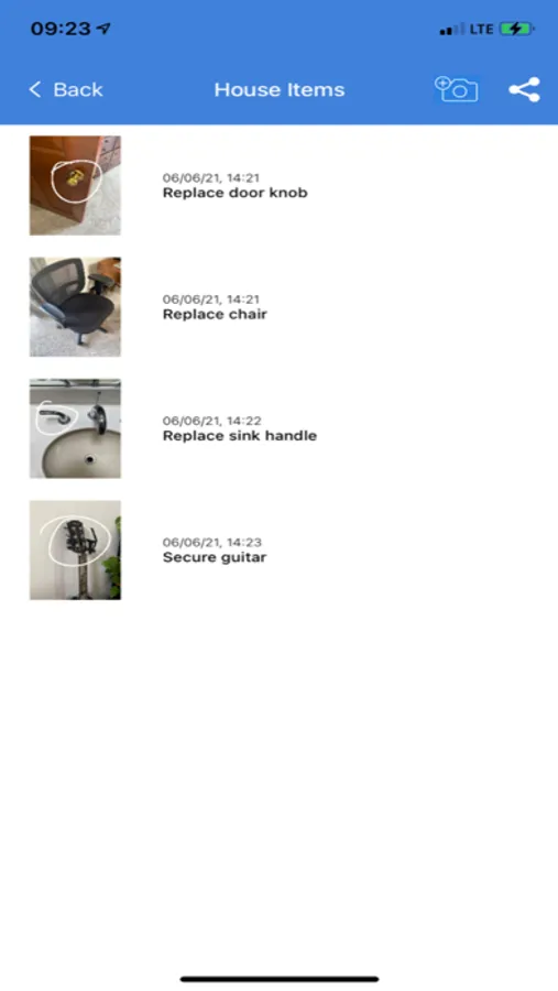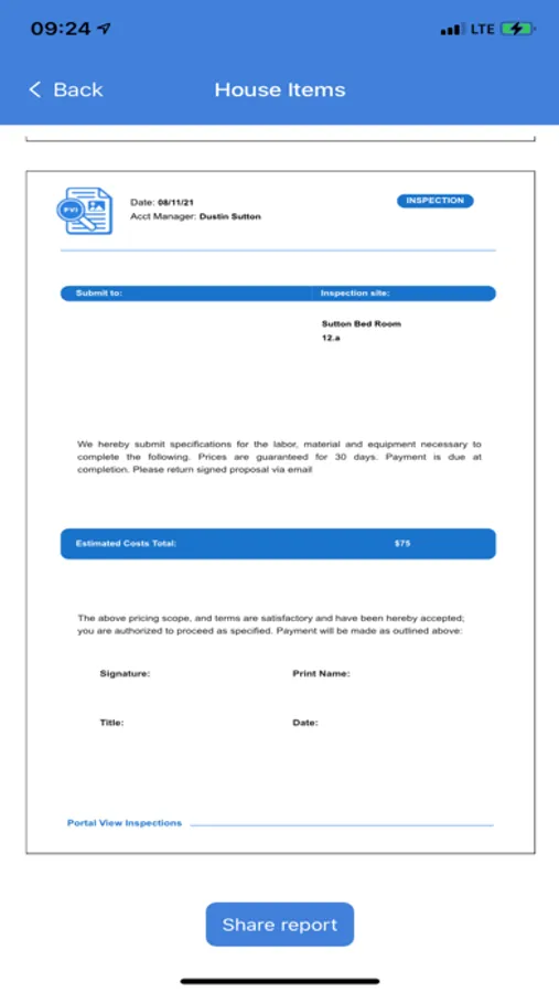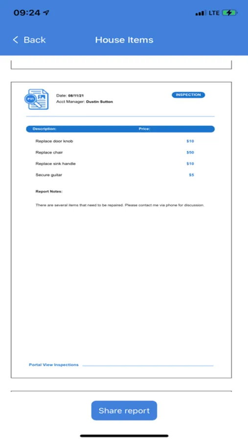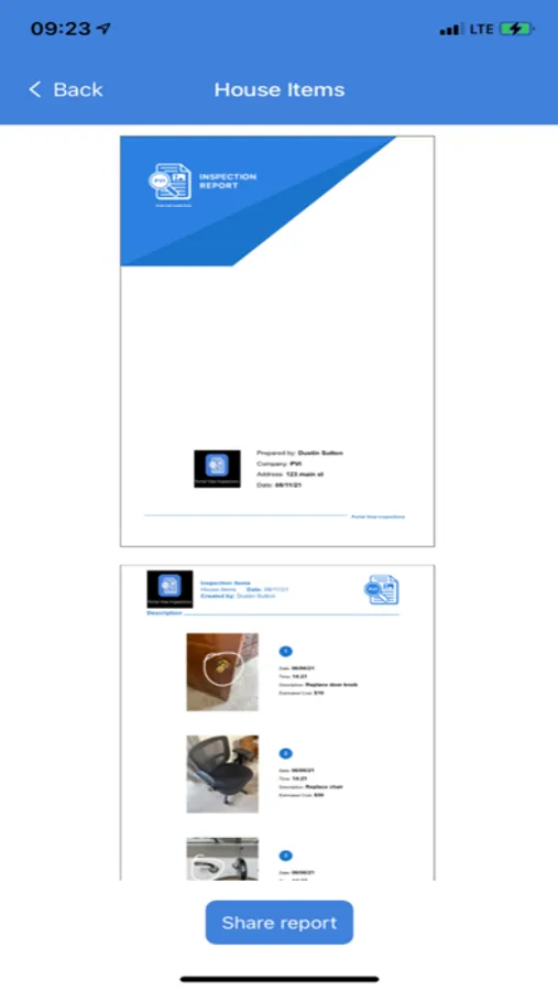 4. Click the Share button to choose how and to whom to send the pdf file with photos, descriptions, and costs automatically created by the photo report application