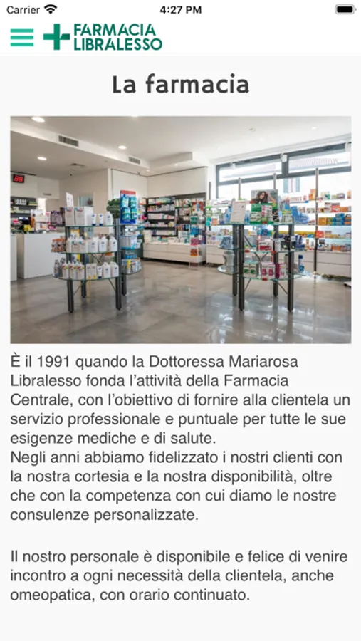 L'App della Farmacia Libralesso di Mira Porte (VR) ti permette di avere i tuoi farmacisti di fiducia sempre a portata di mano con consigli, informazioni, prenotazioni, ordini, richieste di prodotti e servizi in farmacia.