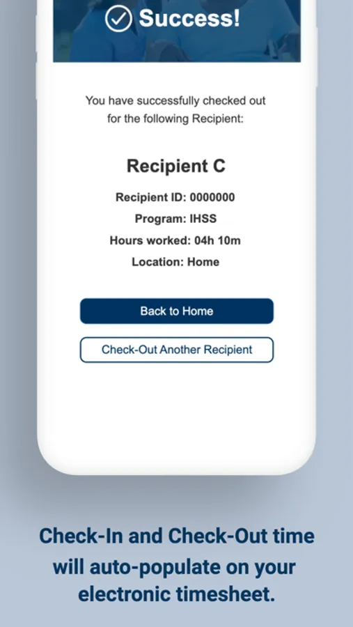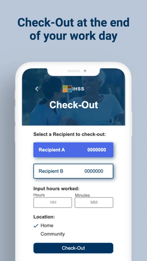 IHSS & WPCS providers will check-in at the beginning and check-out at the end of each work day for each IHSS/WPCS recipient they provide services for with simple easy to use screens. Providers are guided step-by-step to choose the recipient they are working for, if they would like to check-in or check-out, and select if they are in the home or in the community. Additionally, the app will conveniently add the provider’s hours to their IHSS Timesheet at the end of their workday. While the IHSS EVV app captures the start time, end time, and location of the visit using Location Services, it does not track the provider during the visit or at any other time. It simply takes a snapshot of the location when they check-in at the beginning and check-out at the end of each work day.