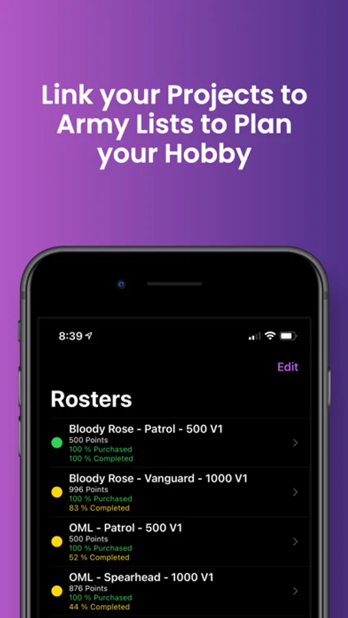 You can even link your painting projects to army lists which automatically update when you make some progress, so you can see how close you are to finishing your lists. This app is not a comprehensive list builder but does have some tools to help you bring in your lists from list builders.