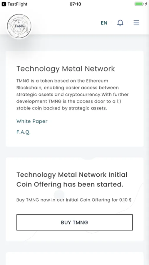 Technology Metal Network (TMNG) provides a digital currency and products for investors to combine strategic asset classes with modern cryptocurrency advantages. TMNG is directly partnered with two investment companies based in Liechtenstein: EMH AG and Red Cave AG. The use case for our TMNG token is that you can directly use TMNG to purchase strategic assets (precious metals, technology metals, or leasing equipment for mining oil & gas) from our partners in a “Coin Shop" online and in our smartphone app.