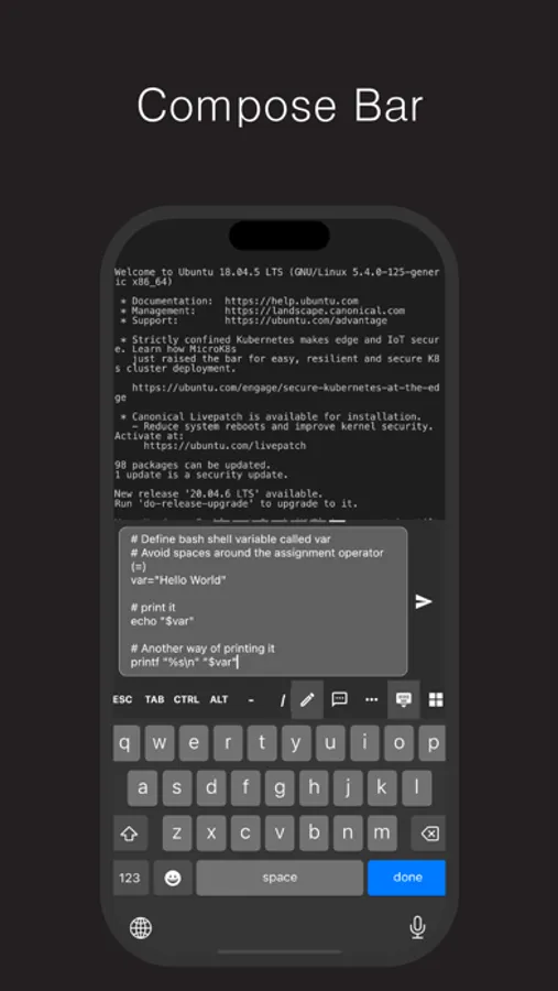 ◦ Compose Bar. The multi-line Compose Bar allows you to type out, edit, and review your string before sending.