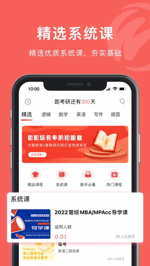 免费、系统,优质的全科课程:包含管综逻辑、管综数学、管综写作、英语二、提前面试、复试的全部系统课程,紧扣管理类联考考试大纲。